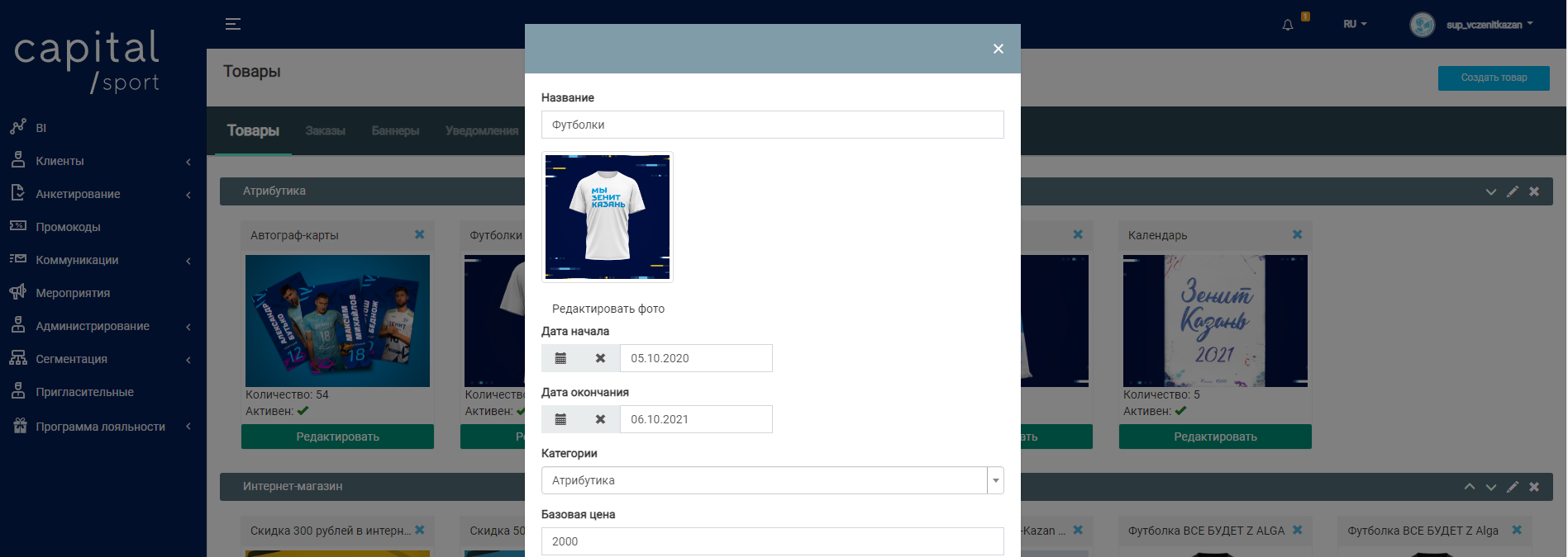 Для того чтобы в разделе приложения Магазин отображались разделы и товары, которые болельщик может получить за былла и приобрести за деньги, необходимо открыть раздел Программы лояльности в Кэпитал Спорт и выбрать подраздел Магазин вкладка товары