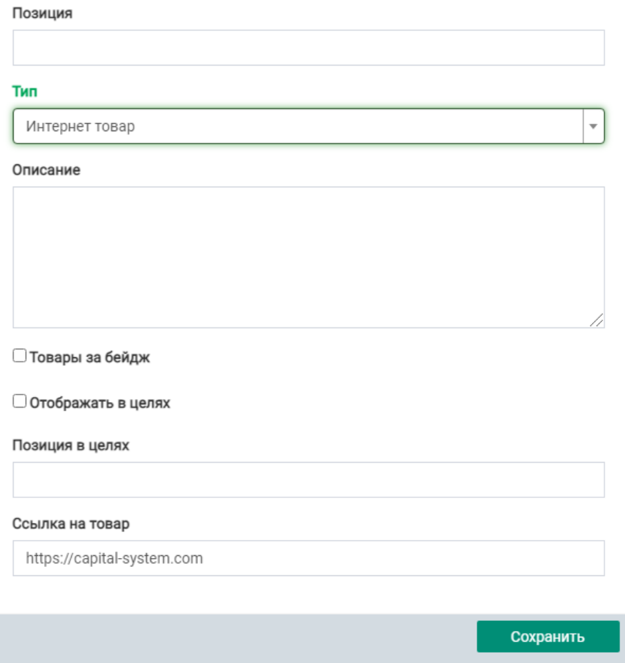 - Позиция в целях (доступно при проставлении «галочки» в поле «Отображать в целях» и необходимо для определения порядкового номера цели);