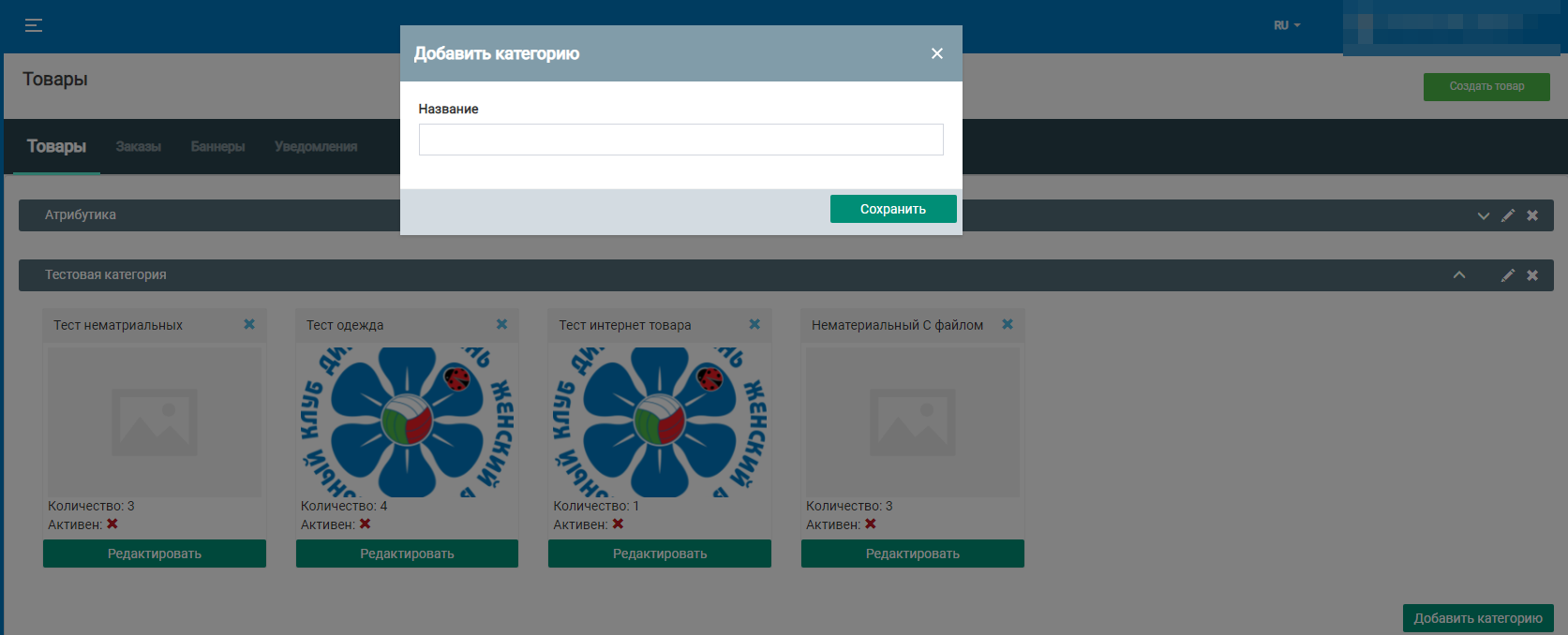 При нажатии на кнопку Добавить категорию открывается карточка для заполнения названия категории товара.