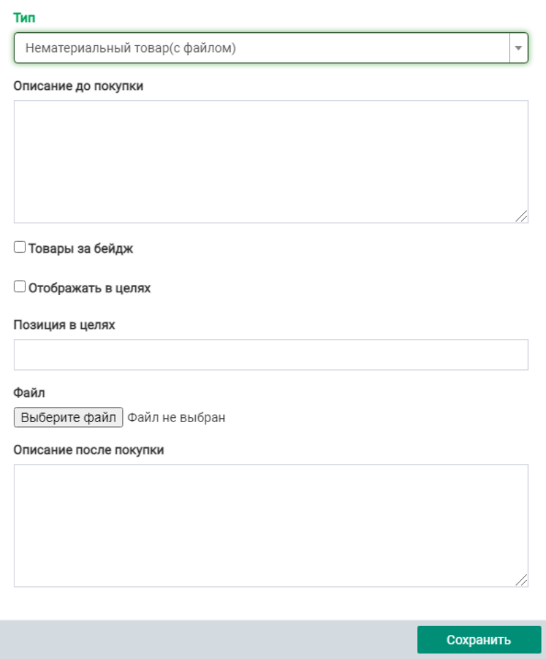 - Файл (поле для загрузки файла, который будет получать каждый болельщик клуба при оформлении товара, формат может быть - jpg, png, pdf);
