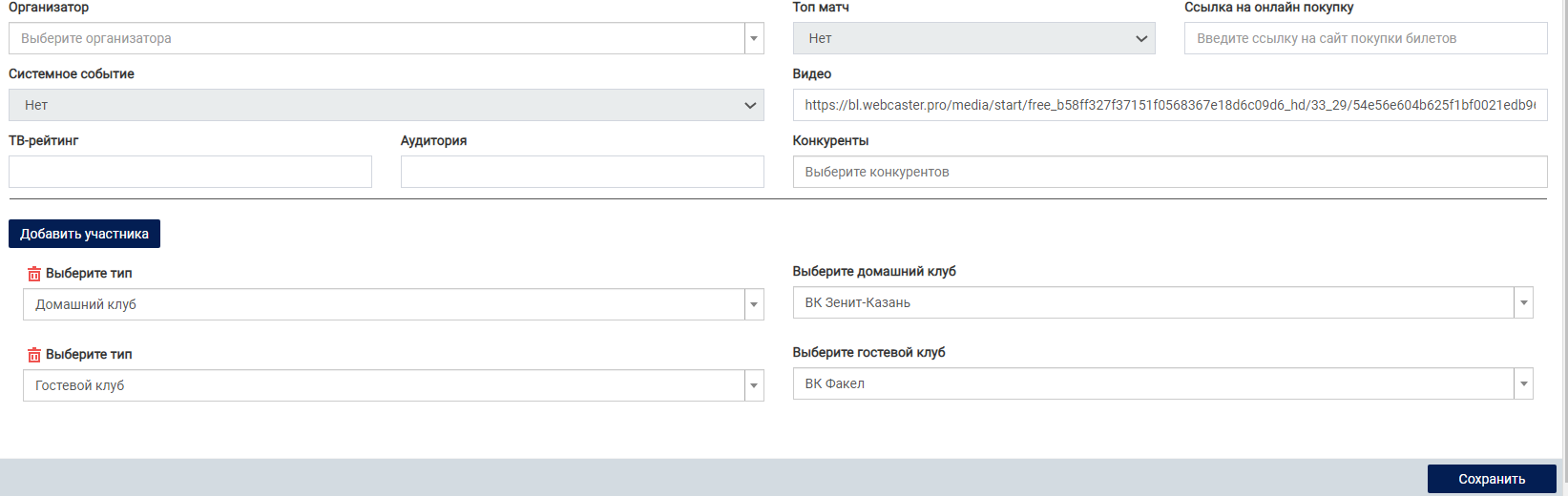 Далее необходимо открыть нужный матч, нажать кнопку «Редактировать», в поле «Видео» вставить ссылку на трансляцию матча
