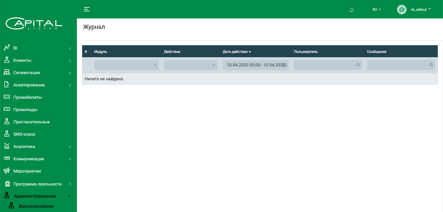 Для того, чтобы посмотреть кто из пользователей заходил в систему и какие действия совершал, необходимо зайти в подраздел «Журналирование»: