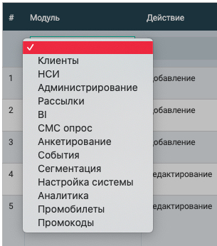 Модуль – раздел, в котором пользователь совершил операцию. Можно сортировать действия по конкретному модулю, для этого нужно нажать на «галочку», после этого появится выпадающее окно: