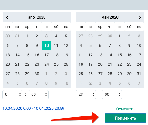 Далее необходимо задать нужный период времени, это нужно сделать в поле «Дата действия», при нажатии на данный элемент откроется всплывающее окно с календарем: