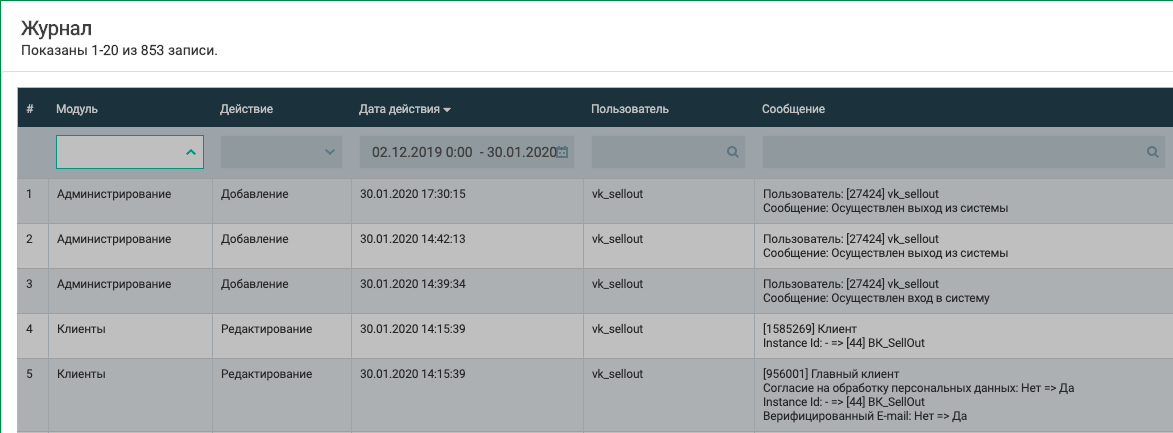При переходе в данный подраздел открывается таблица с записями об операциях, выполненных в системе: