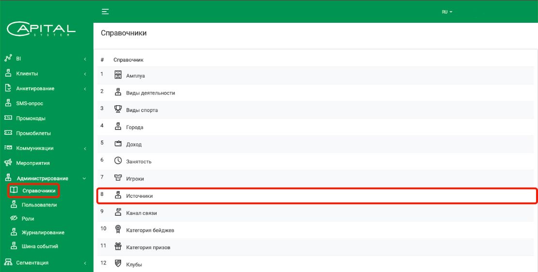 Для того, чтобы добавить новый источник или подысточник попадания клиента, необходимо зайти в подраздел «Справочники» в разделе «Администрирование» и нажать на справочник «Источники»: