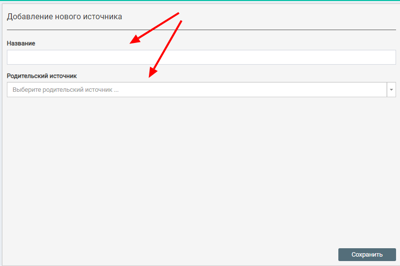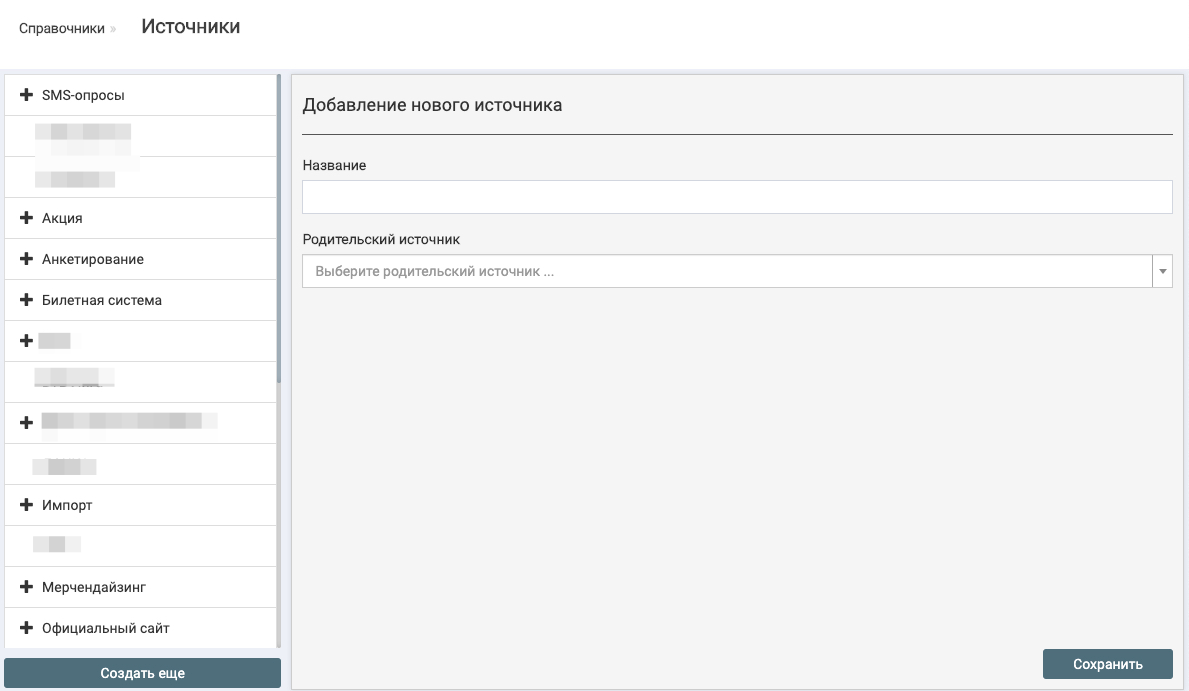 Для создания собственных источников или подысточников необходимо нажать на кнопку«Создать еще»и в открывшемся рабочем окне заполнить следующие поля: