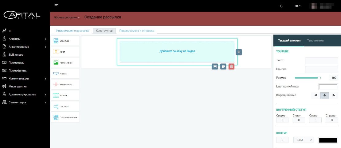 Далее открываем раздел «Конструктор», выбираем блок Youtube и перетаскиваем его в рабочую область