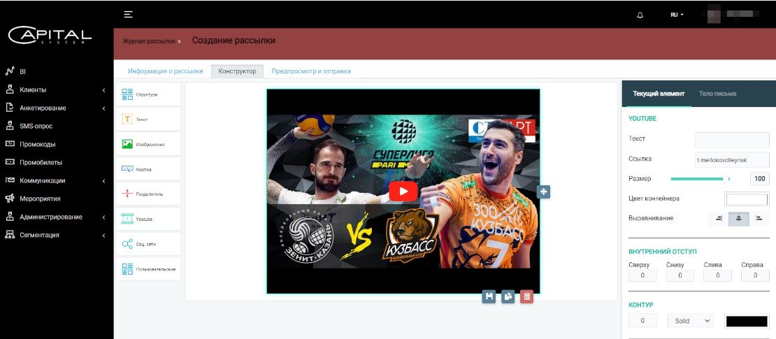 Теперь при использования элемента Youtube в email-рассылках появляется специальный значок «play». А для того, чтобы создать рассылку с блоком Youtube необходимо открыть раздел «Коммуникации» и нажать на кнопку «Создать рассылку» или же перейти в раздел «Шаблоны».